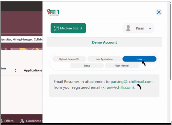 1. If your email is registered by your administrator, then you can use the email to upload resume. Contact your administrator if your email is not registered with RChilli browser assistant.