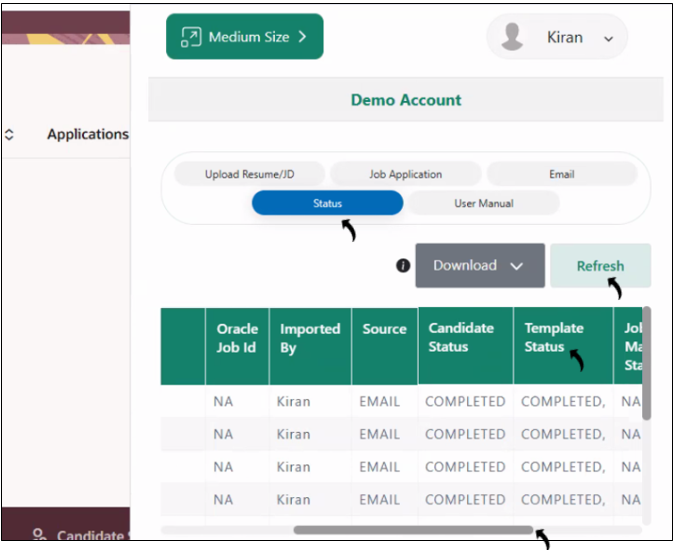 • It takes few minutes to get the resume uploaded in the Status block, click Refresh to refresh the resumes in the Status block.