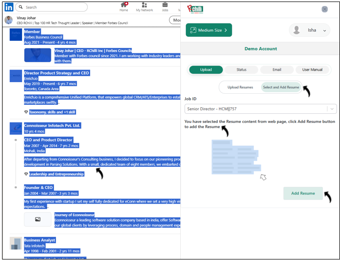 • Copy the resume content from the web browser and click Add Resume on the RChilli browser assistant.