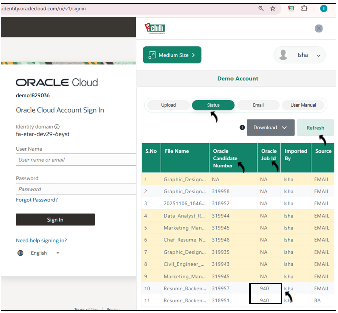 Note: Follow the steps below to view resumes uploaded through the Oracle Extension with a Job ID.