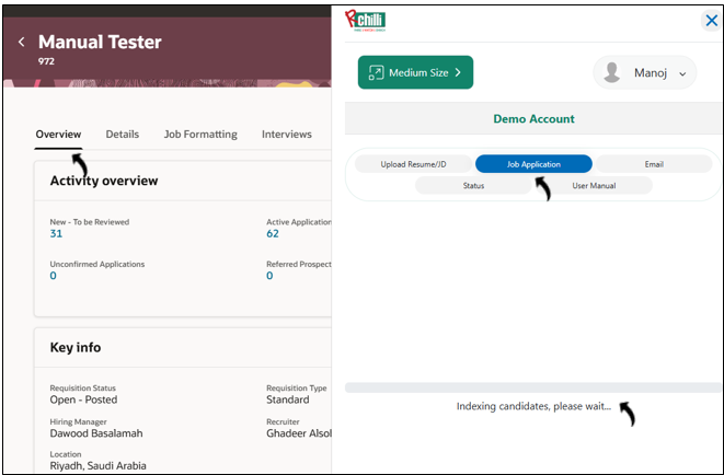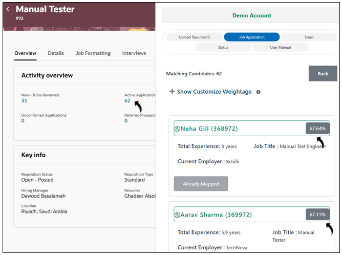 View candidate match scores for a job requisition in the Job Application tab of the Oracle Browser Assistant. Match scores are calculated by the RChilli Search and Match engine.