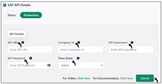 - On the Demo or the Production tab, fill the API URL, Company