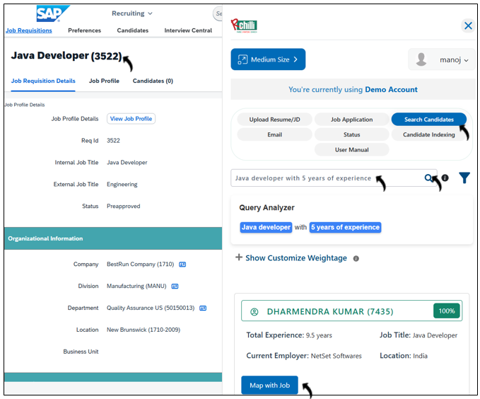 - Once you see the results, click Map with Job to map the candidate to the Job