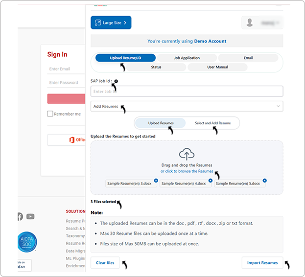 Follow the below procedure to import resumes using SAP extension into the candidate pool of your SAP account.