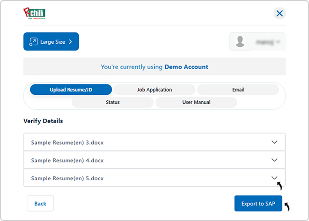 • Once you click Import Resumes in the above step, all the resumes gets uploaded. Click Export to SAP to export the resumes against the Job ID in the SAP account.