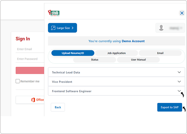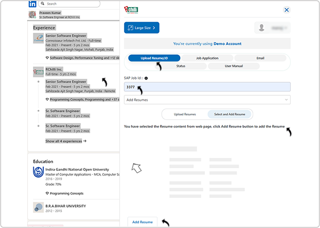 1. Log in to your SAP extension and click Upload Resume/JD tab to upload resume. On the Upload Resume/JD tab, you can either select Upload Resumes or Select and Add Resume, see the following sub-section for more details.