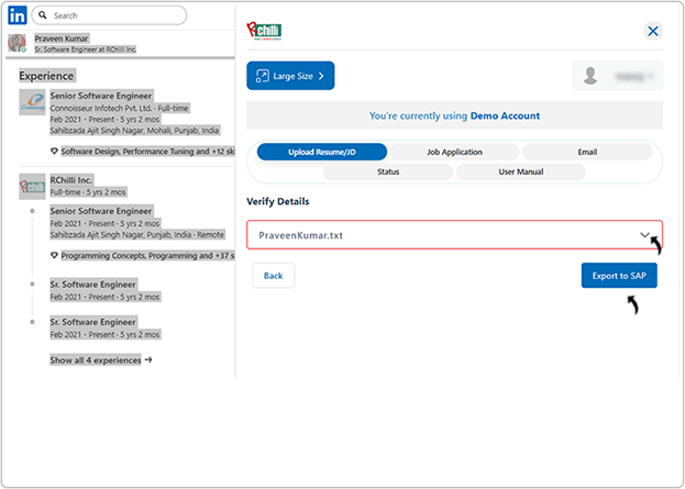 • Once the resume content is added, click drop-down icon to verify and edit the resume details as necessary (see next step for more detail). Once the resume content details verified, click Export to SAP to export the resumes against the Job ID in the SAP account.