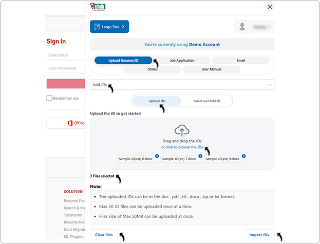 • The uploaded Jds can be in the doc, pdf, rtf, docx,zip or txt format.