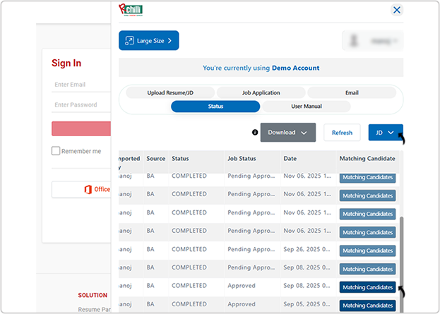 Candidate Status This column displays the resume status whether it is imported successfully or failed or if duplicate resume uploaded. Source This column displays source by which the JD is imported like CE (Chrome extension)