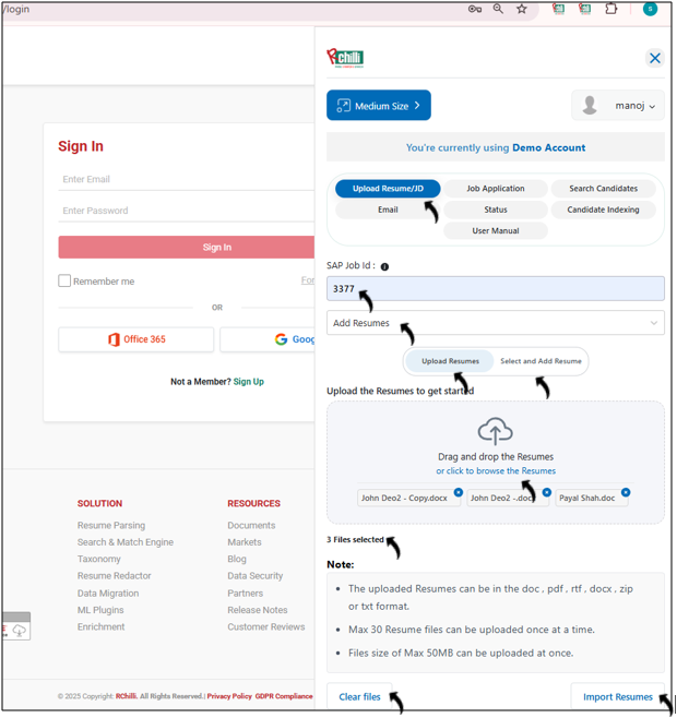 Follow the below procedure to import resumes using SAP extension into the candidate pool of your SAP account.