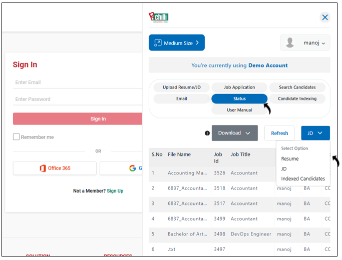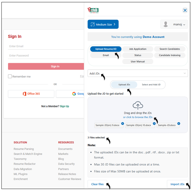 - The uploaded Jds can be in the doc, pdf, rtf, docx,zip or txt format.