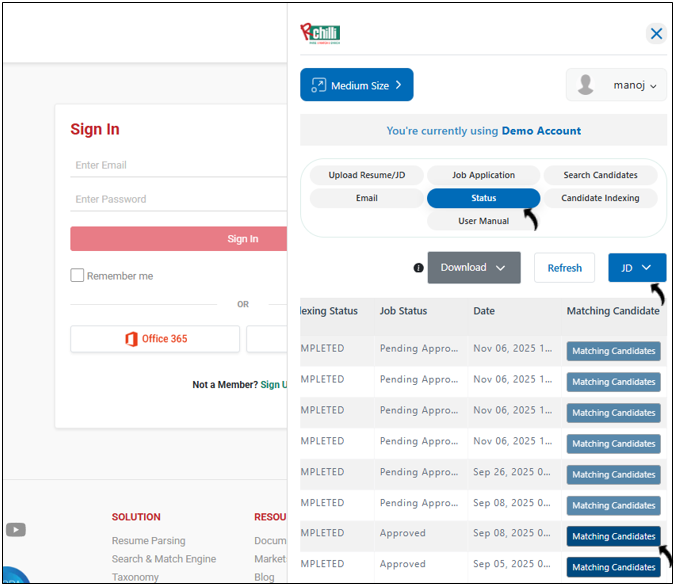 | Indexing Status | This column displays whether indexing of the resume is completed. | Indexing Status | This column displays whether indexing of the JD is completed. | ||