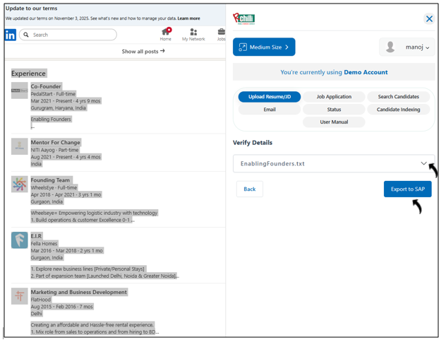 - Log in to your SAP extension and click Upload Resume/JD tab to upload