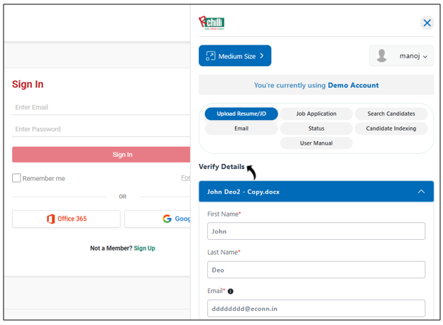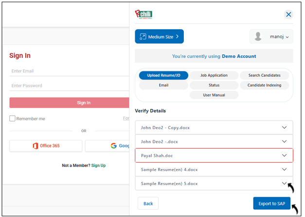 resumes against the Job ID in the SAP account.Note: Click on the drop-down icon against any of the uploaded file to Verify Details of the resume and edit the details if necessary (see below step-2 for more details).