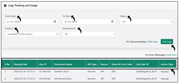 as From Date, To Date, etc, and click Get Logs. All the parsing