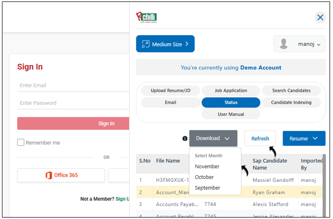 - It takes few minutes to get the resumes or JDs uploaded in the Status tab, click Refresh to refresh the resumes or JDs in the Status tab.