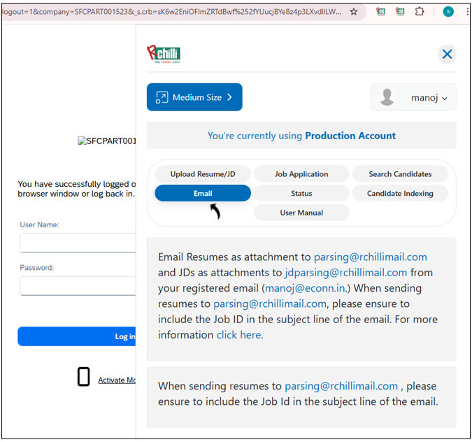 - To upload resumes, send email with an attached resumes to parsing@rchillimail.com from the email that you integrated