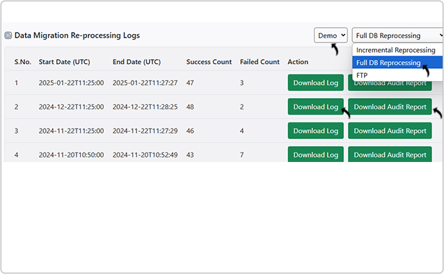 - On the Migration/Reprocessing Logs page, you can do the following: