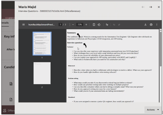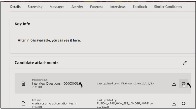 4. In the Candidate Attachments section, locate the attachment titled Interview Questions, and click the View icon to open it.