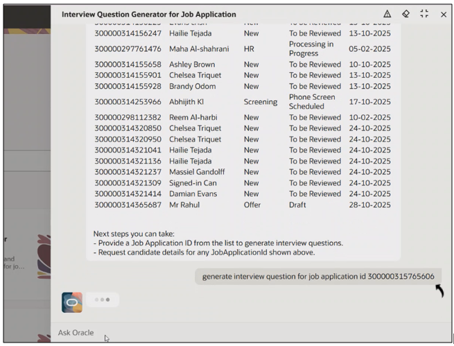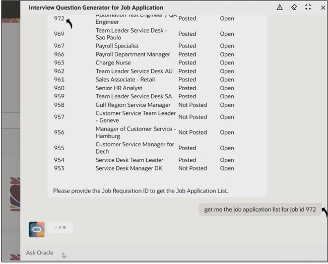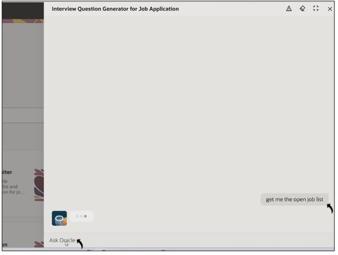4. In the Interview Question Generator for Job Application chat window, type a prompt in Ask Oracle such as: Get me the open job list.