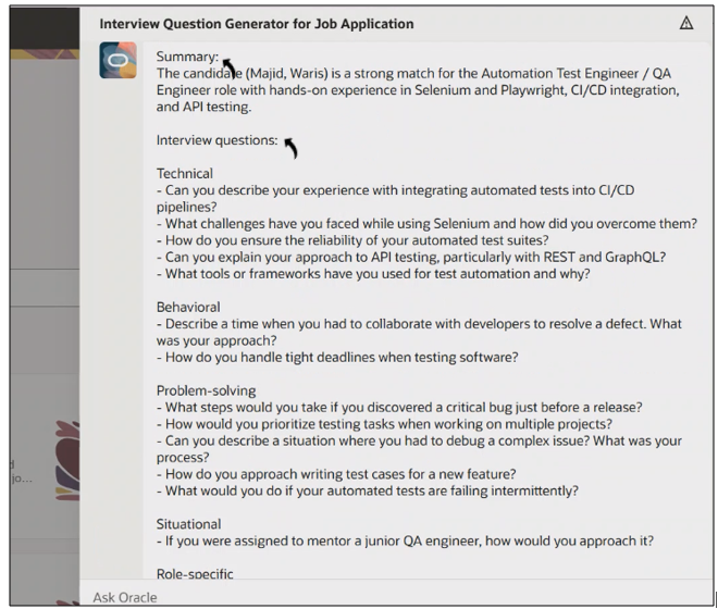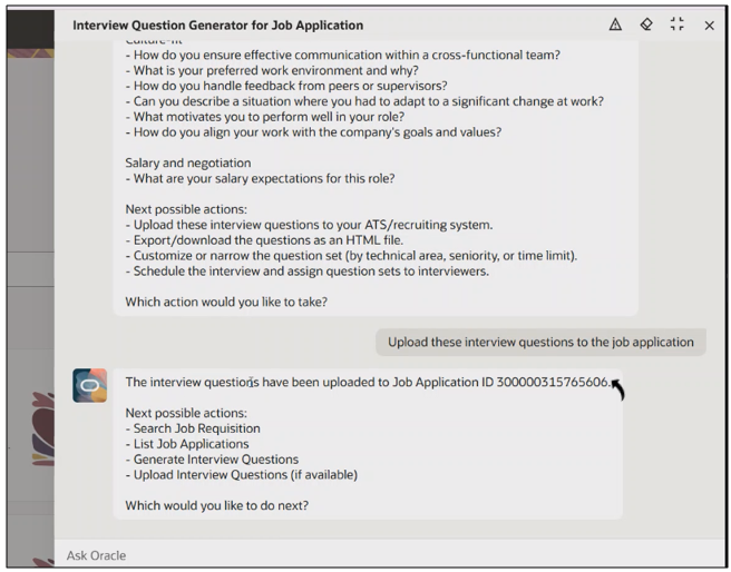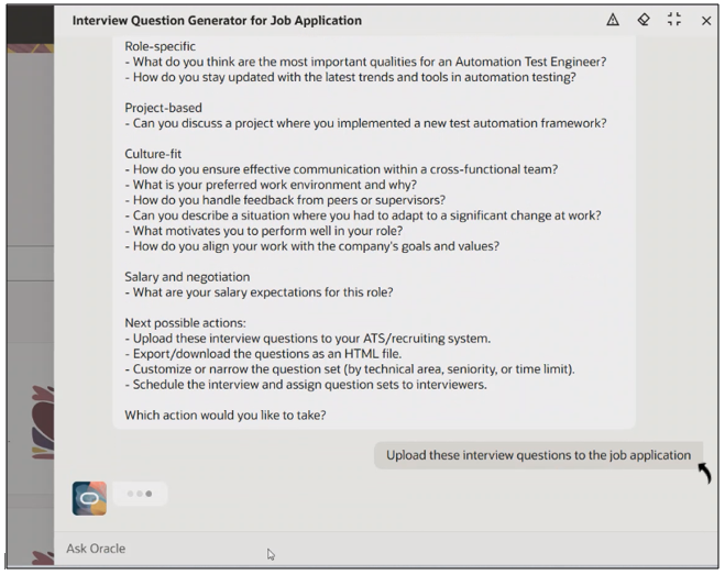 The Interview Question Generator agent enables recruiters to automatically create interview questions for candidates who apply for job openings in Oracle Recruiting Cloud.