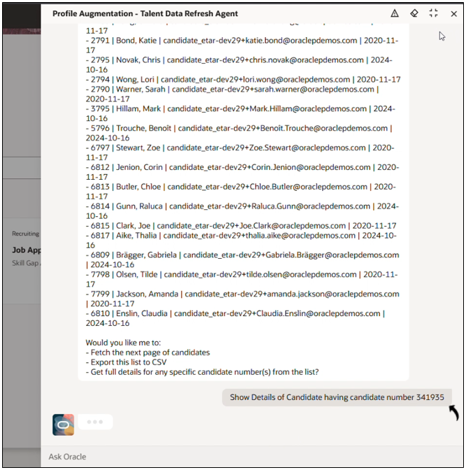 prompt in Ask Oracle such as: Get me the candidate