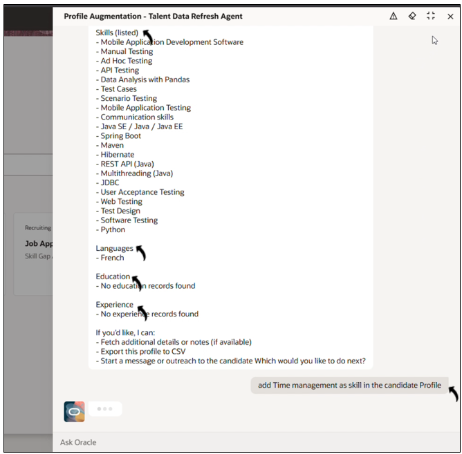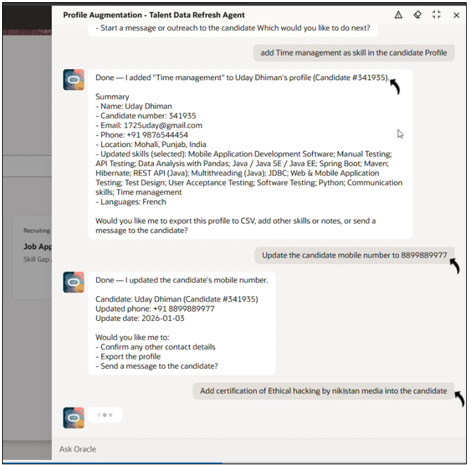 The agent can update candidate skills, certifications, mobile numbers, languages, and other profile information. This helps recruiters ensure that candidate data remains accurate and up to date.